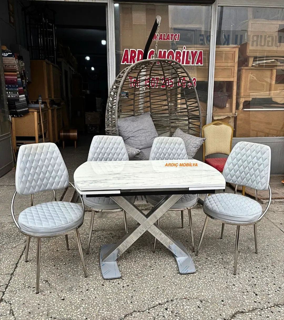 Mermer desenli, metal X ayaklı, açılır mekanizmalı yemek masası. İhtiyaca göre 4 adet veya 6 adet kapitone desenli konforlu sandalyesiyle modern mutfak ve salon dekorasyonuna uyum sağlar.