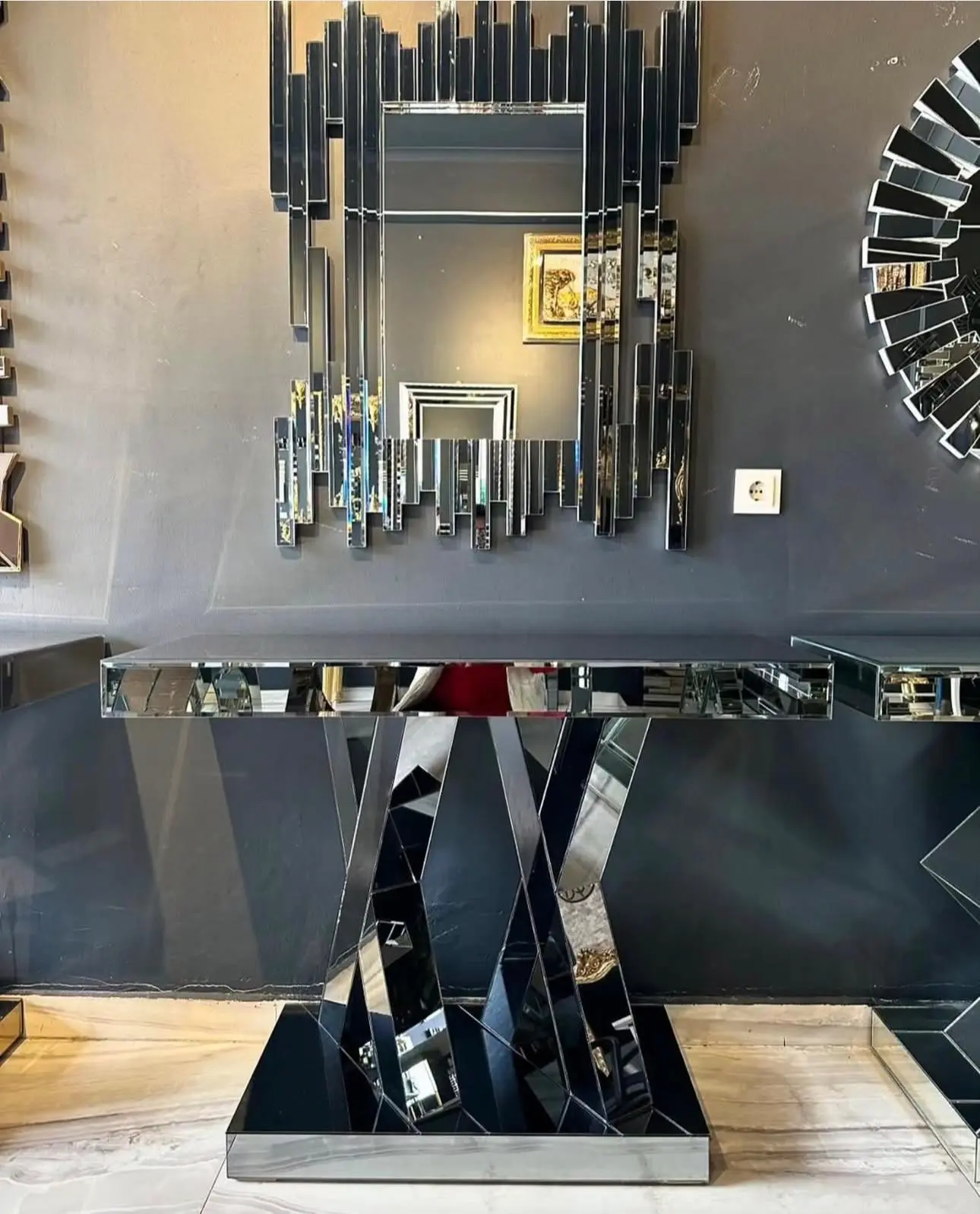 Tamamı aynalı yüzeyi sayesinde mekâna ferahlık ve ışık kazandırırken, geometrik formlu ayak yapısı modern ve prestijli bir duruş sağlar. Salon, antre, hol ve otel konseptli alanlarda hem dekoratif hem de tamamlayıcı mobilya olarak kullanılabilir. Geometrik ayak tasarımı sayesinde güçlü ve dikkat çekici bir duruş sunar.