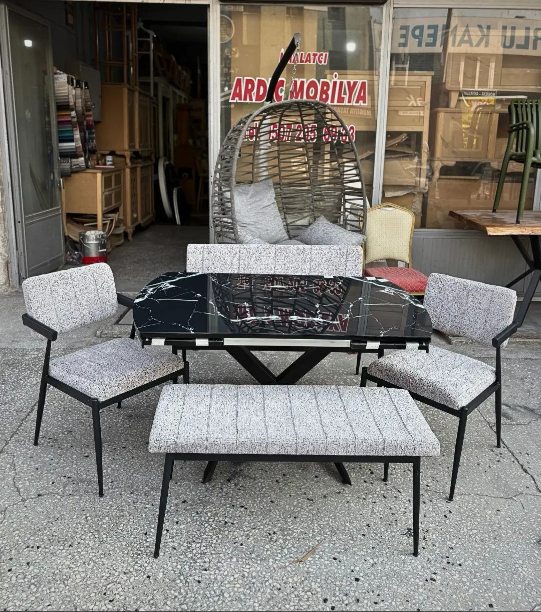 X-ayaklı açılır yemek masası takımı. Mutfak masa sandalye bank takımı.